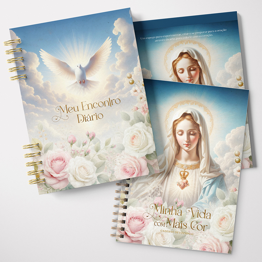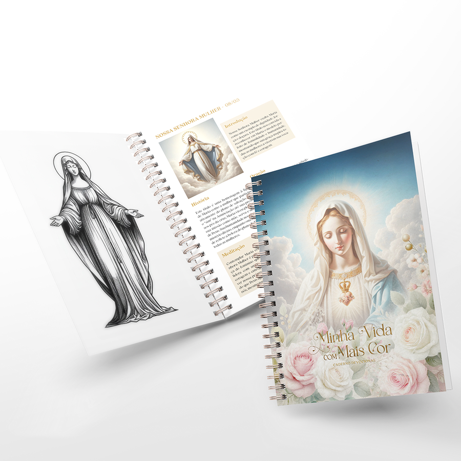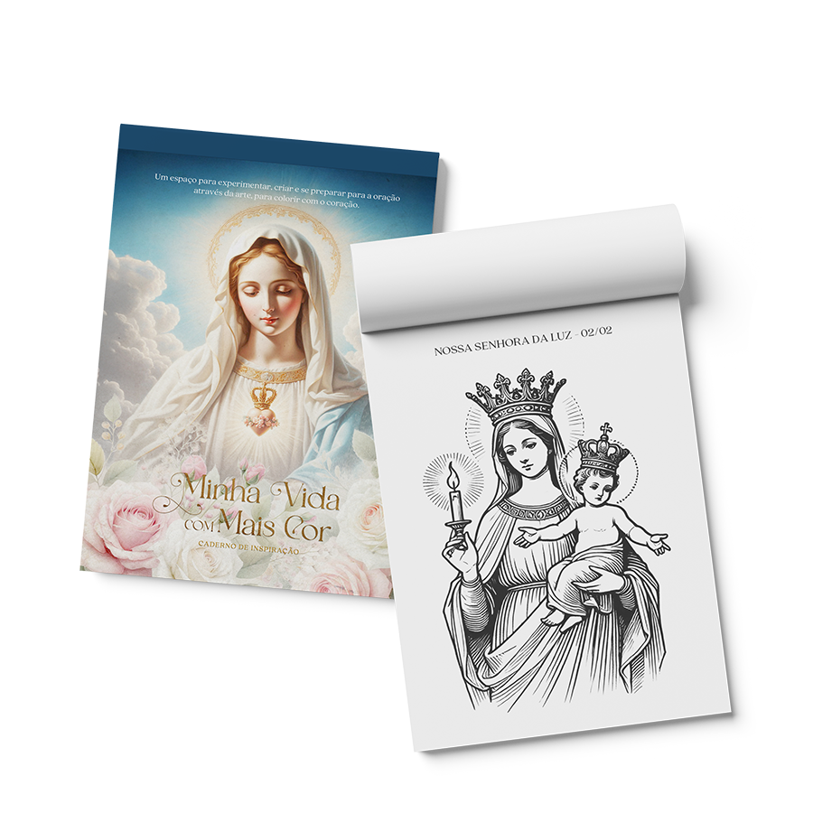 Um caderno devocional de colorir com 48 ilustrações exclusivas sobre aparições de Nossa Senhora, acompanhadas de meditações profundas.